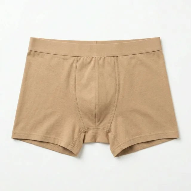 Premium men's boxer briefs in naturally colored organic cotton. Ergonomic fit with soft elastic waistband — no marks, no irritation. 100% undyed with natural antibacterial properties (7A-10A) for lasting freshness. Inseam length, waistband style, and set quantity fully customizable.